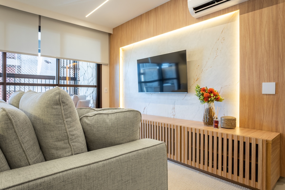 Appartamento di lusso di 50 mq nel Condominio Azure, con design contemporaneo, arredi completamente progettati e finiture sofisticate. Suite con letto king-size e biancheria da letto di alta qualità, elegante soggiorno con divano letto su misura, aria condizionata a soffitto in tutte le camere e Wi-Fi veloce. Cucina completamente attrezzata, elettrodomestici di alta qualità, 1 posto auto, molta luce naturale. Posizione privilegiata in Rua 135, vicino a tutto. Comfort, raffinatezza e praticità per 4 ospiti