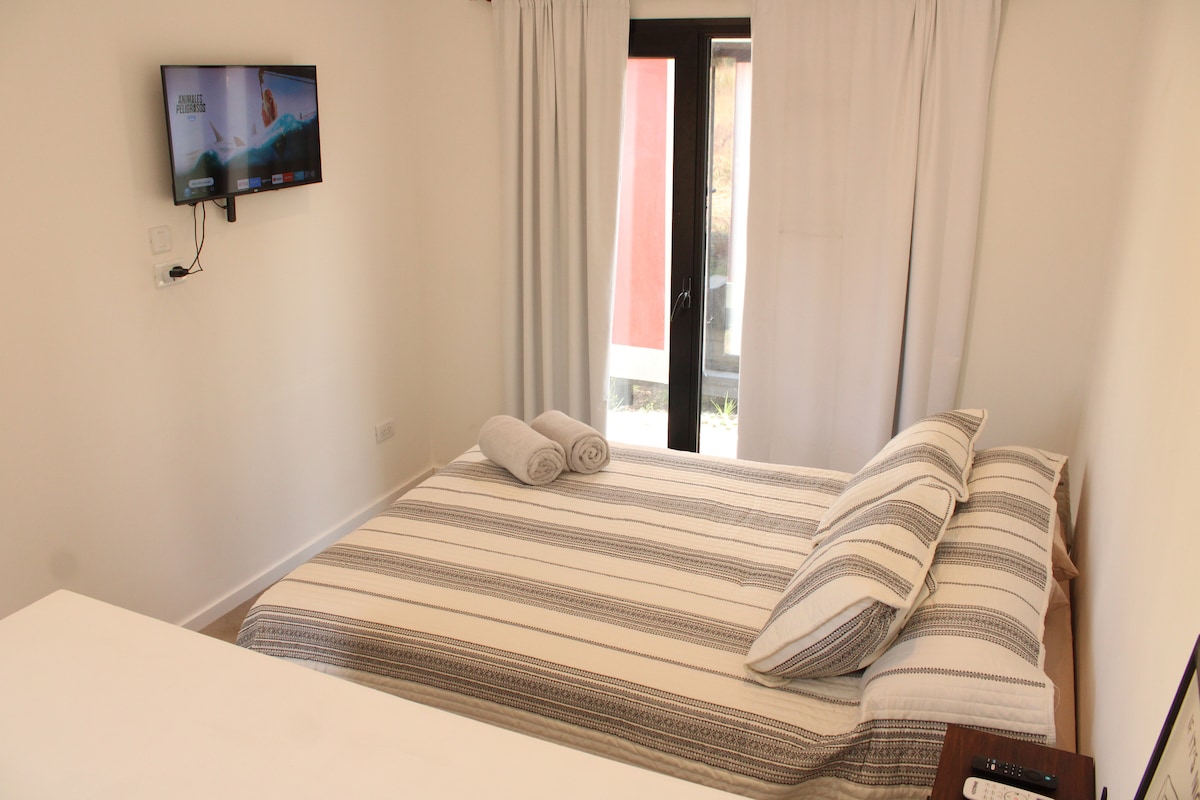 Alojamiento ubicado en un predio tranquilo, muy cerca de las sierras de Tandil. El espacio es integrado y cuenta con cama matrimonial, aire acondicionado frío-calor, baño privado con ducha y cocina equipada con heladera, anafe eléctrico doble, horno, pava eléctrica y utensilios básicos. Pileta compartida con otros alojamientos (no climatizada). Cada unidad dispone de parrilla exterior individual y estacionamiento propio.