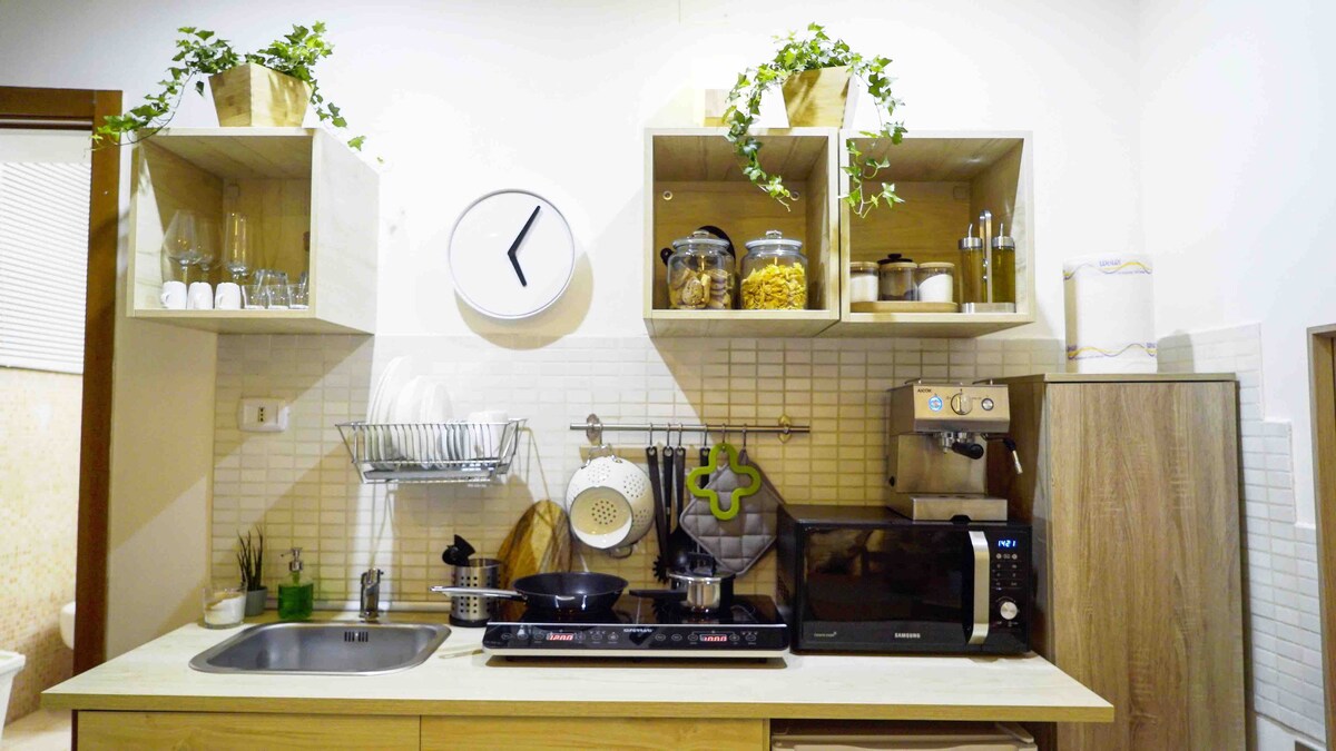 Monolocale di 27 mq, a piano terra, munito di tutti i comfort, l'arredamento è funzionale, confortevole e curato, l'angolo cottura, completamente attrezzato, sostituisce il servizio di colazione e consente l'autonoma preparazione di qualsiasi pasto; il bagno è fornito di cabina doccia e lavatrice. Le maioliche del pavimento ed il paraspruzzi della cucina sono state dipinte a mano dal proprietario.