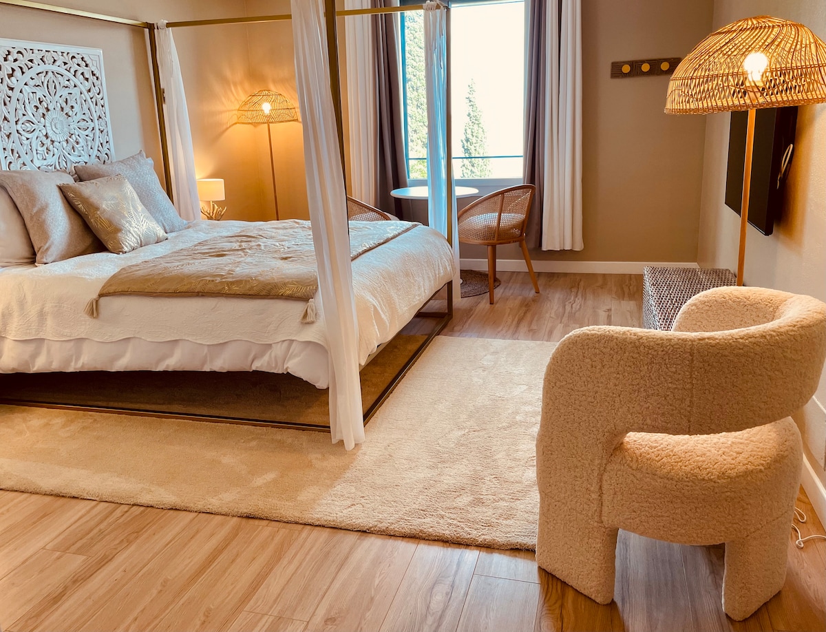 Ricarica le batterie a La Lagune con la sua splendida vista panoramica. Arredamento bohémien-chic, letto a baldacchino king-size preparato all'arrivo, bagno con cabina doccia. Aria condizionata. Magnifico giardino boschivo, soleggiata piscina di acqua salata. Area relax e pranzo in giardino. Splendidi sentieri pedonali e ciclabili nei dintorni. Entrata privata e terrazzo)