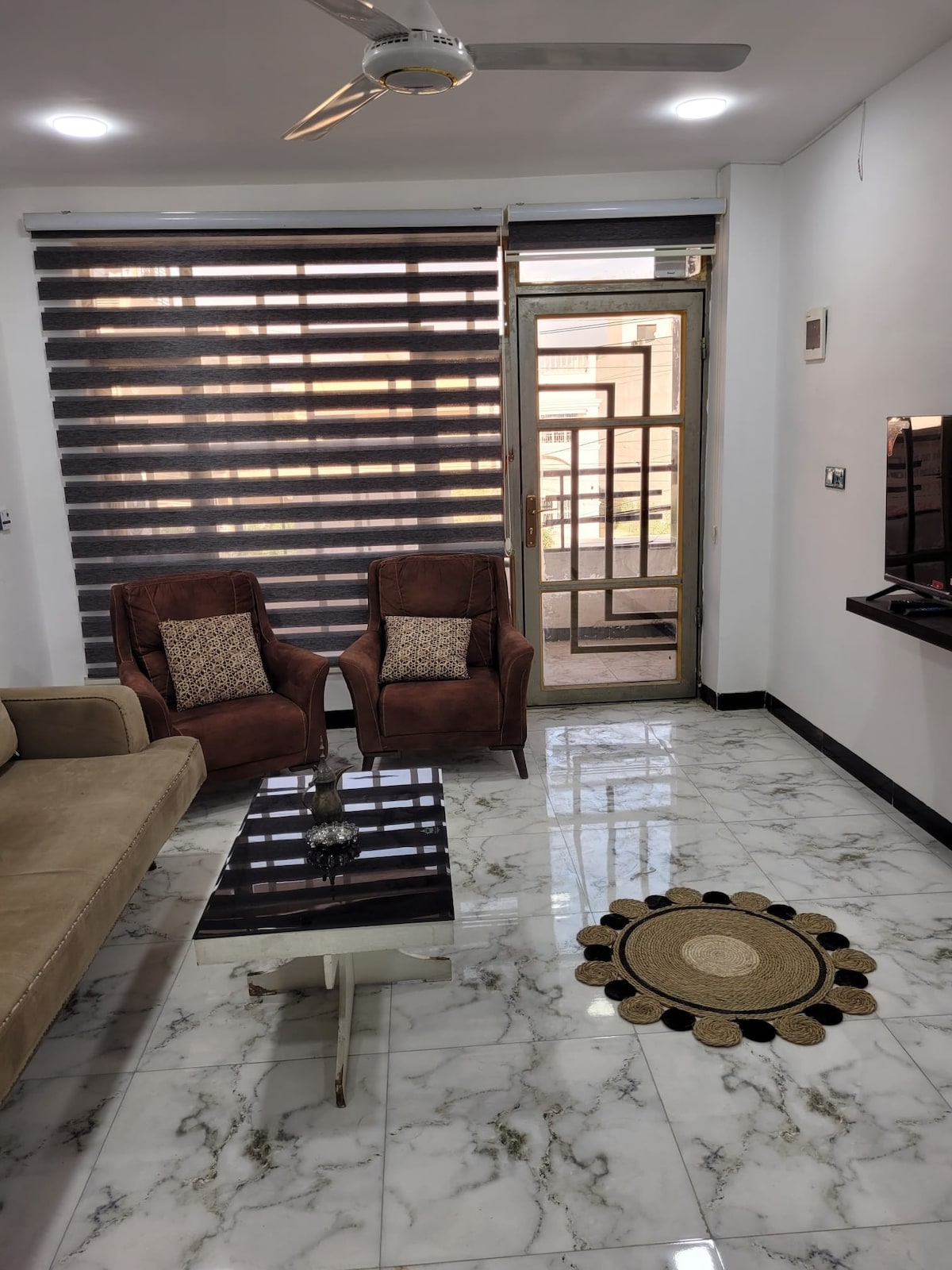 City center charm! Queen bed oasis w/ single option, heart of Mansour. Walk to shopping malls, cafes & more. AC chills, compact kitchen fuels. Modern nest near public transport. Unwind on comfy sofas, wash & stay. Your downtown Baghdad