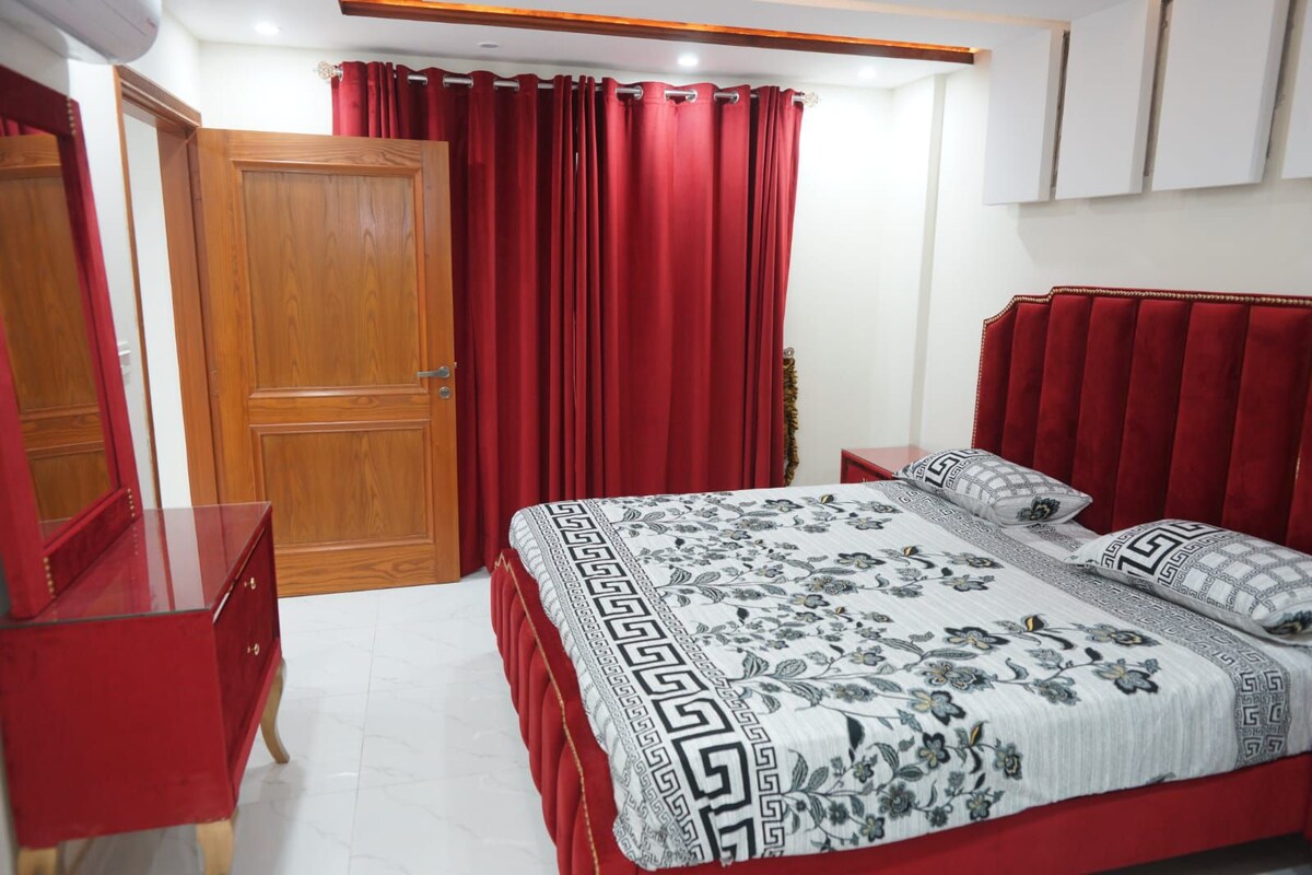 Goditi un appartamento moderno e completamente arredato con 1 camera da letto a Johar Town Phase 2, Lahore, situato vicino all'Emporium Mall e all'Expo Centre. Perfetto per famiglie, viaggiatori d'affari o soggiorni di breve durata, questo elegante appartamento presenta interni eleganti con carta da parati geometrica, calda illuminazione da incasso, TV a schermo piatto con console di intrattenimento, aria condizionata e WiFi ad alta velocità. Goditi il comfort di un angolo cottura ben attrezzato e di un edificio sicuro e protetto con parcheggio disponibile. (AL 2° PIANO)