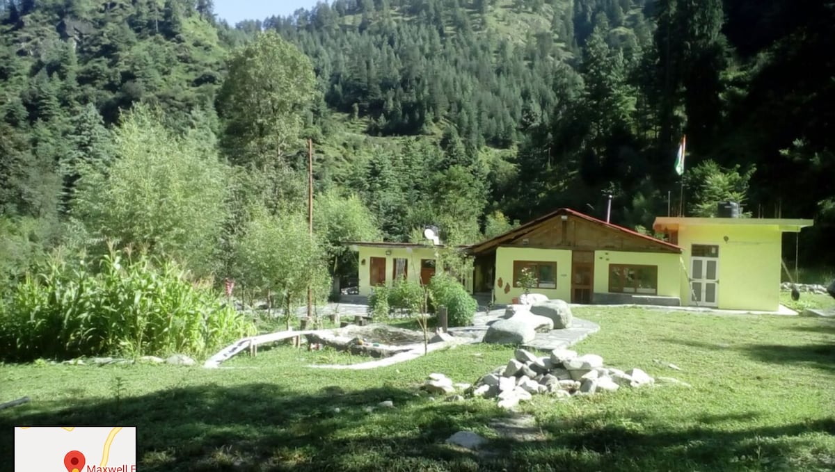 A perfect, peaceful spacious farm-garden located across the river, 400m downstream from Gushaini bridge in Tirthan Valley, the house is covered with Foliage and all-timber, low-ceilinged interiors offering a family room with a double bed and two single beds & a bathroom. Access is by low-slung log footbridge or in high water, an exciting basket-on-a-cable affair across the rushing river. The kitchen serves utterly delicious fresh home-style Indian meals, there is also a library and garden area.