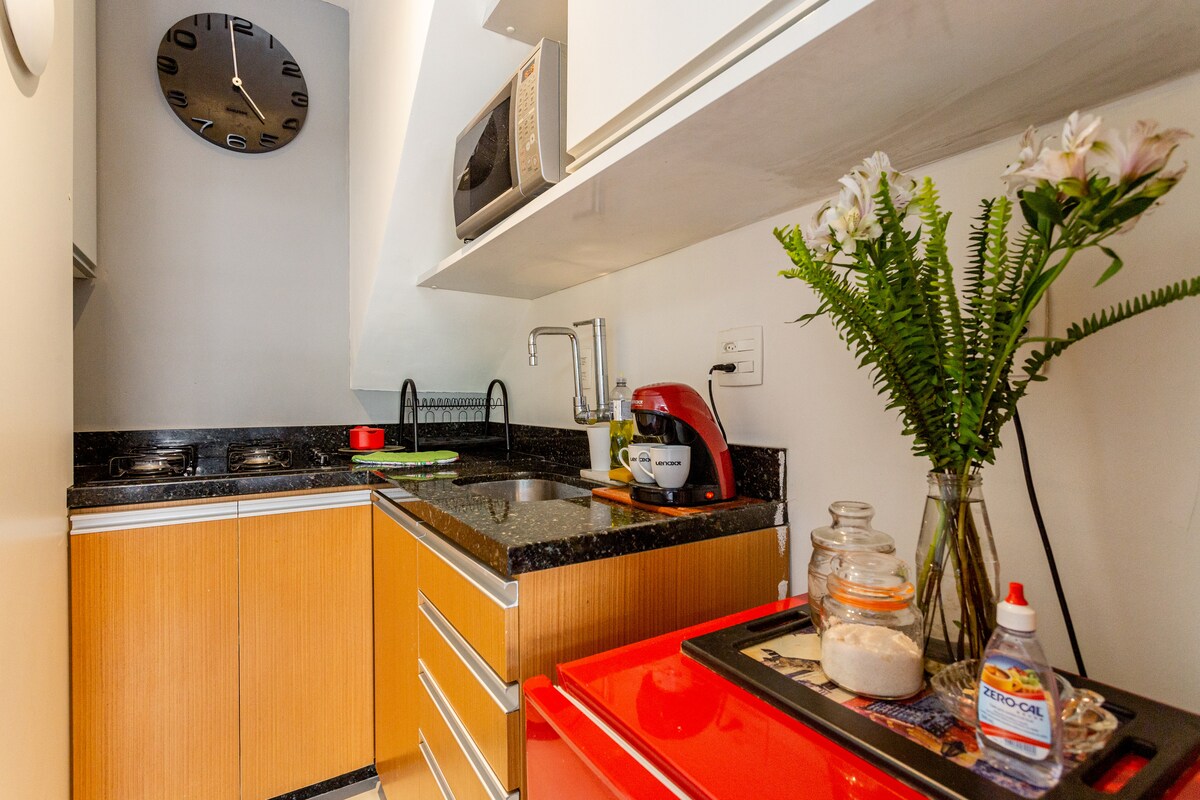 Loft recentemente ristrutturato, con arredamento pulito, serratura digitale, camera da letto e soggiorno integrati con cucina americana e completamente attrezzata. Moderno e sicuro, questo alloggio si trova in un condominio con portineria 24 ore su 24 e telecamere di sicurezza, in una delle migliori posizioni di Copacabana (posto 5), accanto al Museo dell'Immagine e del Suono, con vista sul mare, circondato da una grande varietà di servizi, come bar, ristoranti, lavanderie, mercati, banche.
