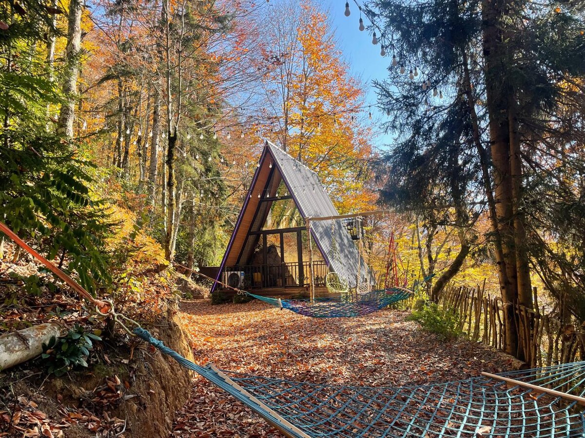 A-frame cabin immersed in Guria nature, few meters from the river and on the way to Gomi mountain. Outdoor kitchen, toilette and hot bamboo shower. Free parking, Wi-Fi, outdoor activities and sharing social open space.