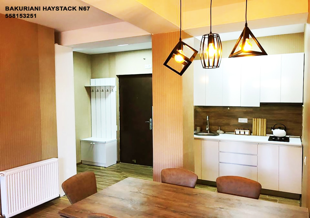 Il residence "Didveli" si trova nel posto migliore del resort di Bakuriani, ai margini della foresta e a soli 400 metri di distanza dall'autostrada "Didveli", in una zona super ecologica. Il residence è dotato di parco giochi per bambini, parcheggio gratuito, negozio di alimentari e ristorante. Considerando tutte le normative sul Covid19, l'ambiente è sicuro e protetto. L'appartamento è dotato di attrezzature di lusso e ristrutturato in modo particolare.