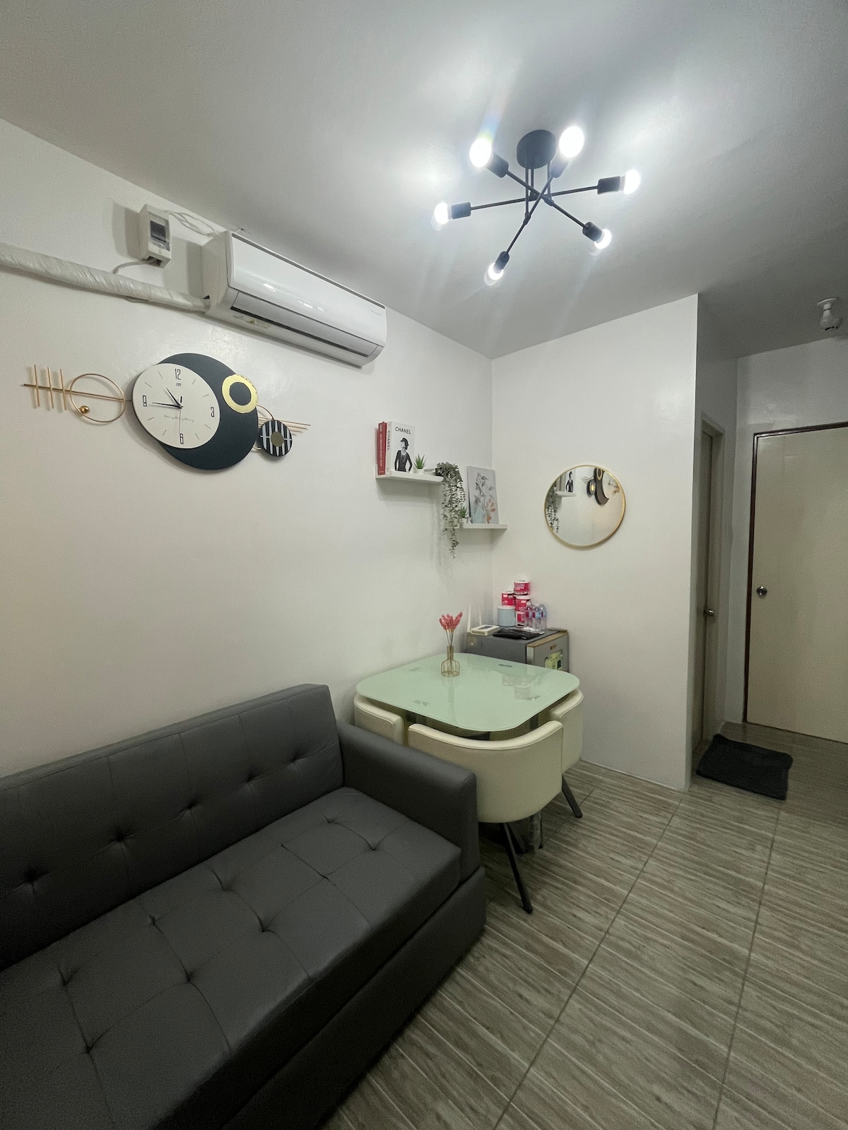 Accogliente e confortevole monolocale situato nel cuore di SMDC Cheer Residences a Marilao, Bulacan! La nostra unità è completamente arredata e dotata di tutto il necessario per un soggiorno confortevole e piacevole, tra cui un comodo letto matrimoniale, un divano letto, una TV a schermo piatto, un tavolo da pranzo, un angolo cottura con frigorifero, forno a microonde, bollitore elettrico e utensili da cucina di base, un bagno privato con doccia calda e fredda, piscina, sicurezza 24 ore su 24 e reception.