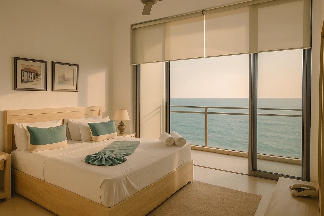 Questi spaziosi appartamenti con due camere da letto a Hikkaduwa, situati di fronte all'oceano, sono ideali per un soggiorno confortevole. Ogni camera è dotata di aria condizionata, armadio, asciugatrice e specchio. L'appartamento è dotato di due bagni, nonché di un soggiorno separato con ventilatore e di una cucina completamente attrezzata con tutto il necessario: frullatore, bollitore e stoviglie. Goditi la vista pittoresca sul verde e sull'oceano, che creano un'atmosfera di comfort e tranquillità.
