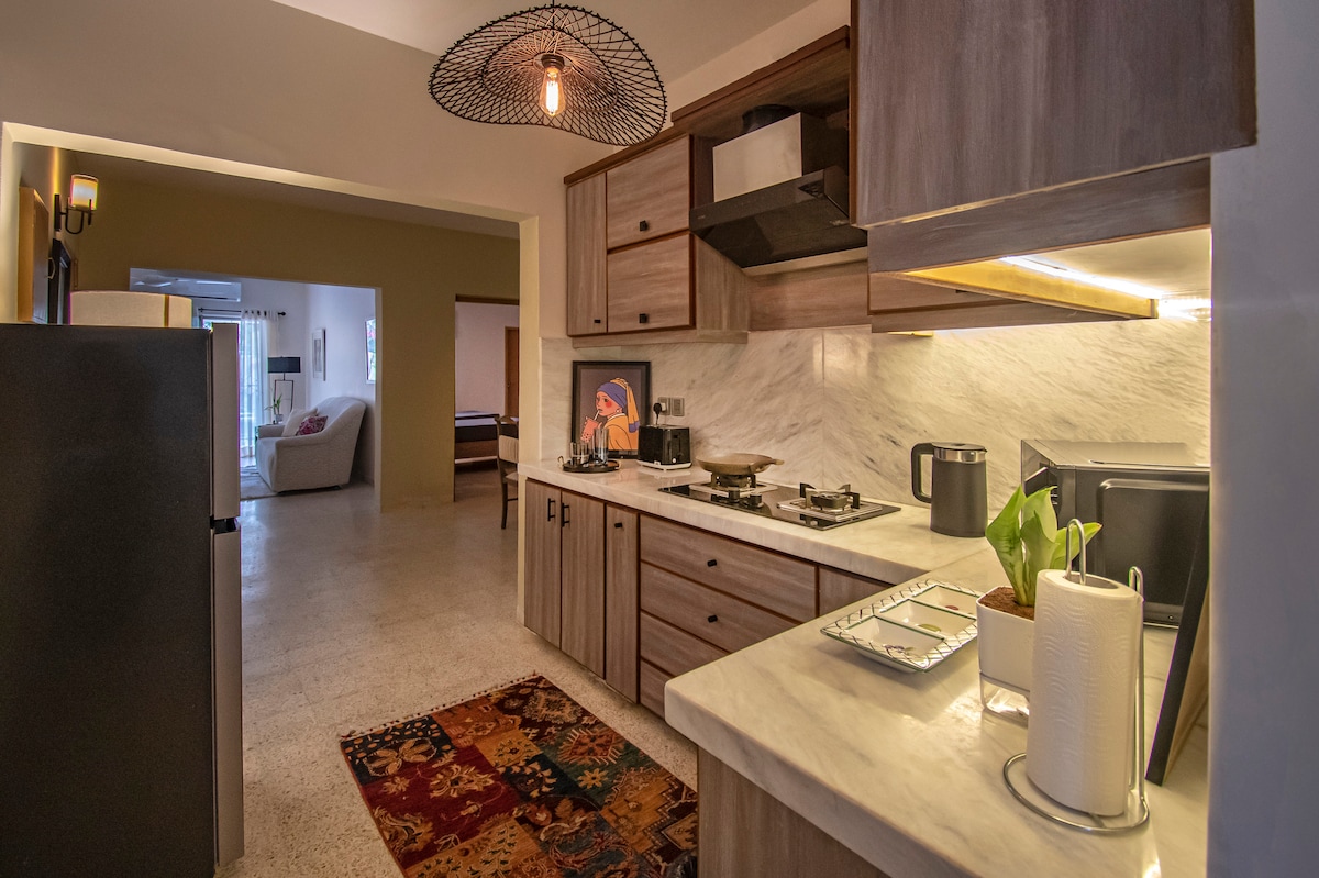 Goditi un soggiorno confortevole in questo accogliente appartamento con 1 camera da letto e divano letto, situato al 2° piano in un edificio familiare nel cuore di Muslim Commercial, DHA Phase 6. Lo spazio include un proiettore privato di alta qualità per l'intrattenimento. L'appartamento offre un ambiente sicuro e protetto con telecamere a circuito chiuso all'esterno e parcheggio in strada. A pochi passi dalla spiaggia e da alcuni dei migliori chai dhabas della zona, è il luogo perfetto per rilassarsi e godersi l'energia unica della spiaggia di Karachi.