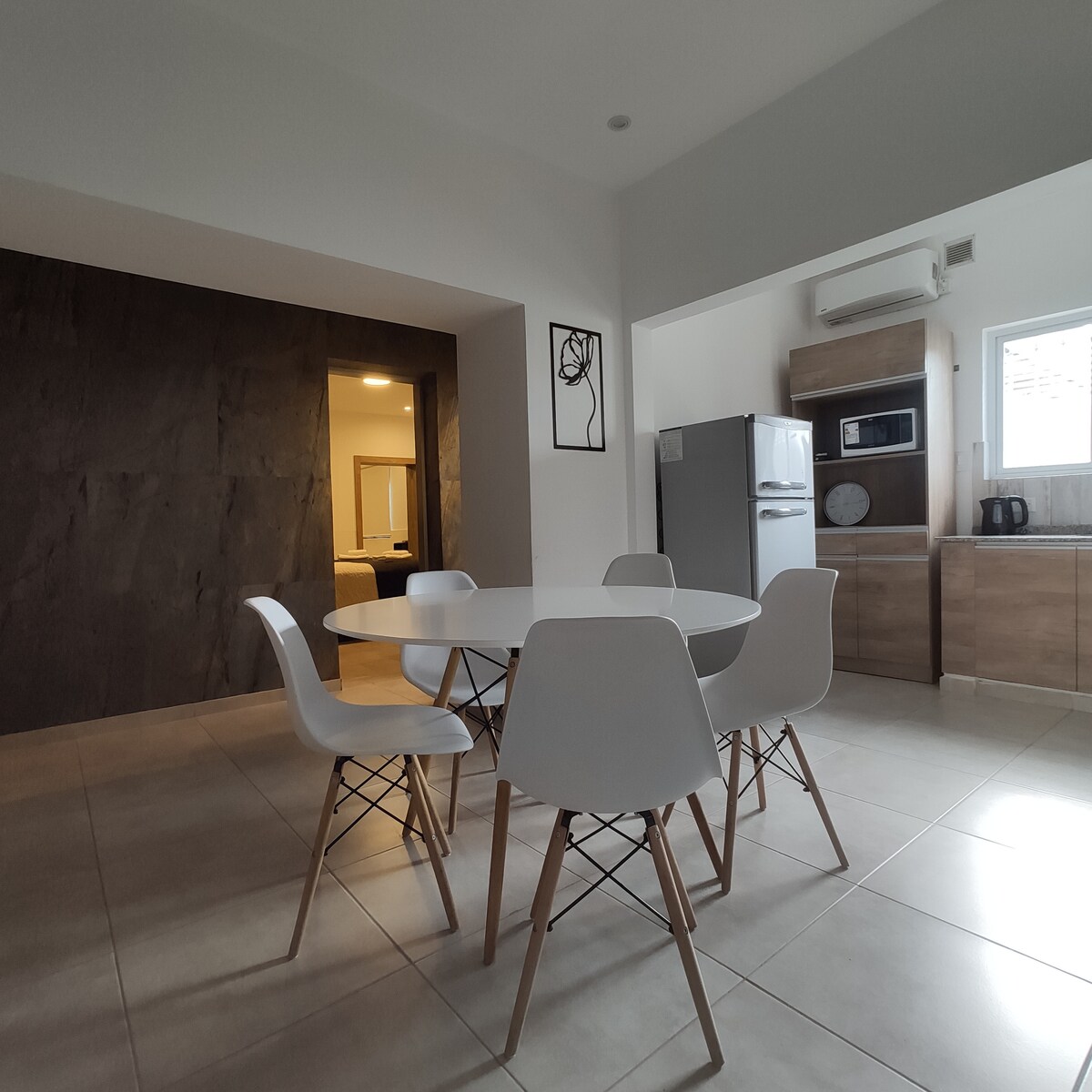 Ampio soggiorno-pranzo con TV con tutti i servizi di streaming. Cucina completamente attrezzata con stoviglie, macchina per il caffè, tostapane e tacchino elettrico. Camera da letto comoda con letto a due piazze e ampio spazio di archiviazione. Letto aggiuntivo per 1 adulto in salotto con possibilità di prolunga letto marino per un bambino(materasso 1.70). Riscaldamento a gas e AA. Ottima posizione: 300 mts Plaza San Martín (casa governativa), 500 mts Calle Bs As (centro commerciale) e 800 mts dalla costa fluviale.