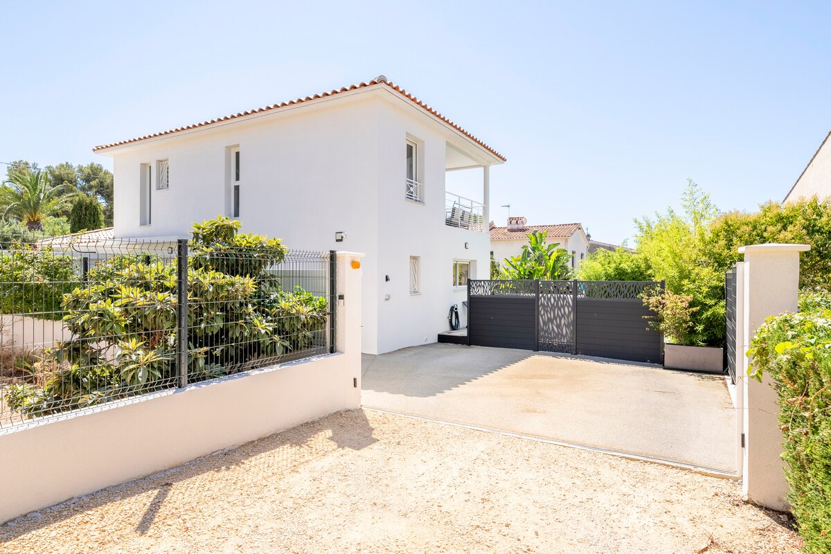 Affittiamo la nostra affascinante villa familiare di 120 m2 abitabili, completamente climatizzata, costruita nel 2022, situata a 100 m dalla baia di Capellan (con ristorante)e a 10 minuti a piedi dalla spiaggia Rènecros e dal centro della città di Bandol, soddisferà grandi e piccini della famiglia con la sua piscina riscaldata (a seconda della stagione) Vicino a tutti i servizi (minimarket, polli, pizze, farmacia ...) A 150 m dai campi da tennis e padel .