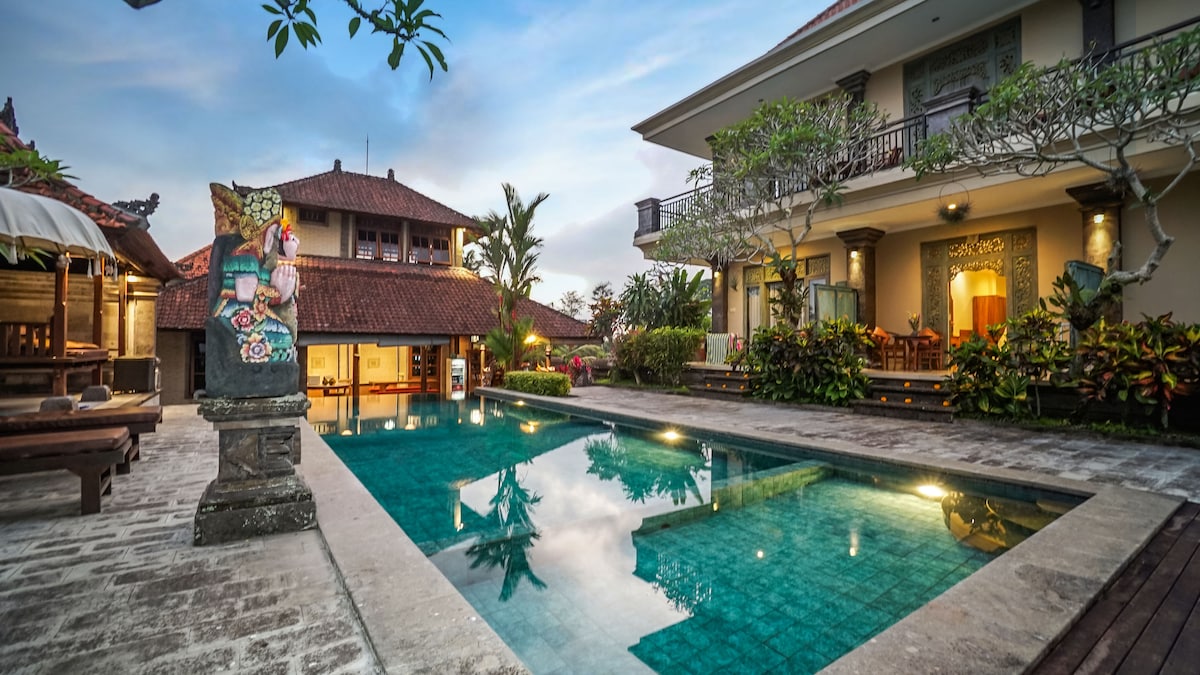 Our spacious and comfortable rooms have a queen-sized bed and provide hot and cold shower,wifi access,fan and Airconditioner . Breakfast is included. We are located just 700m away from Monkey Forest and a 10 minute walk away from Ubud center. Im also provide taxi service for pick up,drop off,day trips around Ubud: Rice terrace Holy water temple Coffee plantation Waterfall Elephant cave temple Sunrise trekking Water rafting Cycling tour Cooking class Etc Please asking me for more information:)