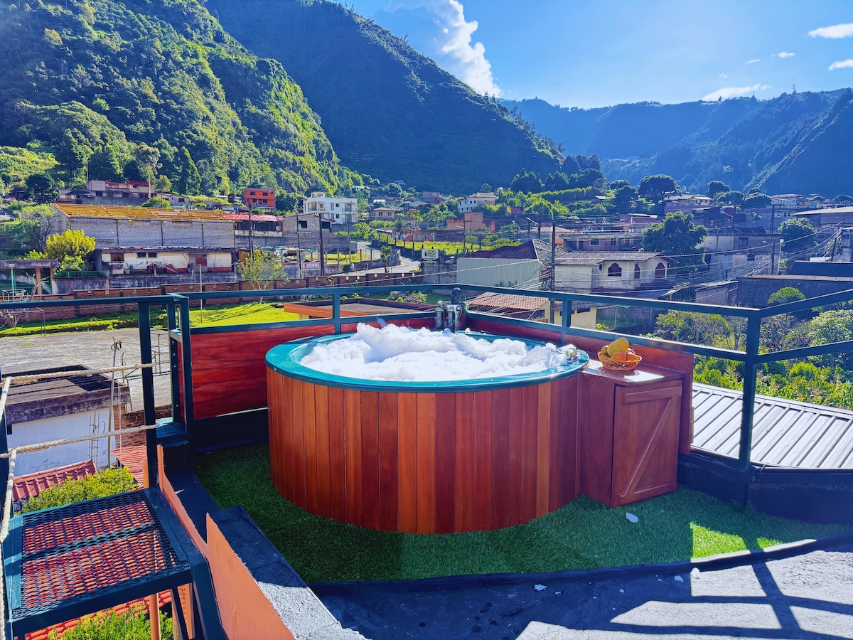 Illari Loft Suite ti invita a vivere un'esperienza unica a Baños. Svegliati con una vista spettacolare sulle montagne e goditi l'alba dal comfort di un moderno e accogliente loft pieno di luce naturale. Perfetto per coppie in cerca di tranquillità, comfort e connessione con la natura, in pieno centro città.