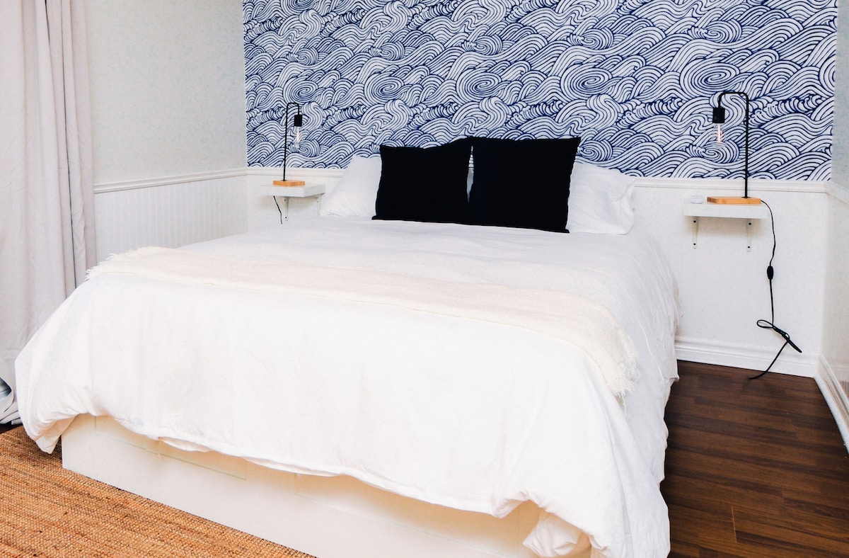 Grazioso appartamento privato. L'ingresso autonomo senza chiavi dell'appartamento si trova sulla scala originale della casa dalla porta d'ingresso. Una camera dispone di un letto king-size e di una culla singola. Il bagno è aggiornato con una grande vasca con doccia. La cucina è dotata di elettrodomestici in acciaio inossidabile ed è completamente rifornita di caffettiera, bollitore, pentole e padelle Keurig. La smart TV offre Netflix e Crave, a cui è possibile accedere dalla camera da letto, mentre la TV del soggiorno offre Shaw Direct e Apple TV.