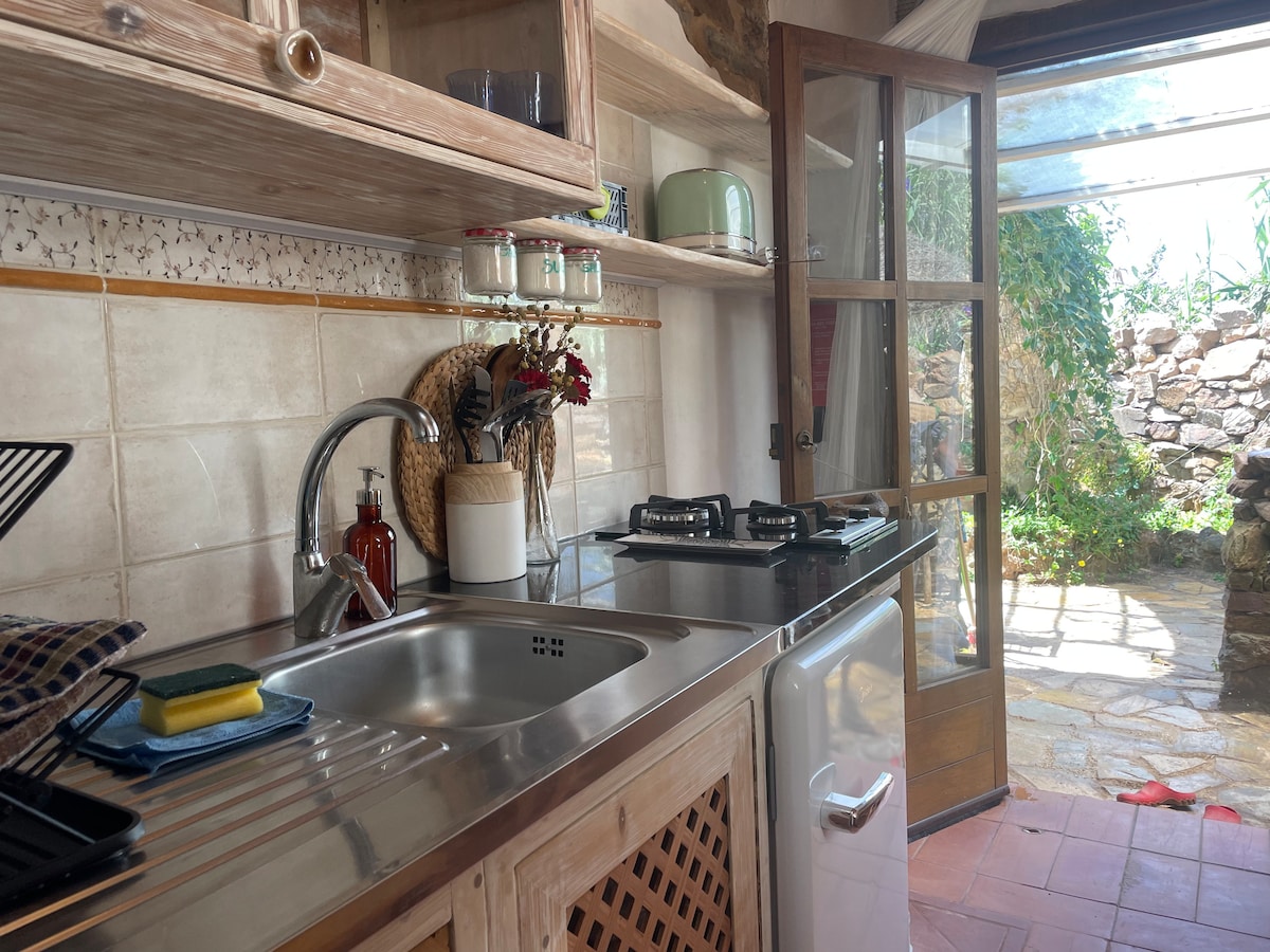 Monte da Cunca consists of buildings with eight studios of different sizes, the name of this accommodation is ALMA, measuring 15 m2. The studio is designed to be functional, simple, and clean, but with special attention to detail, is an open space, downstairs you will find a fully equipped kitchen and the bathroom with shower, on the top floor a double bed 140 by 200. Outside you have your private space with chairs and table, as well there is a common area to share with the other guests .