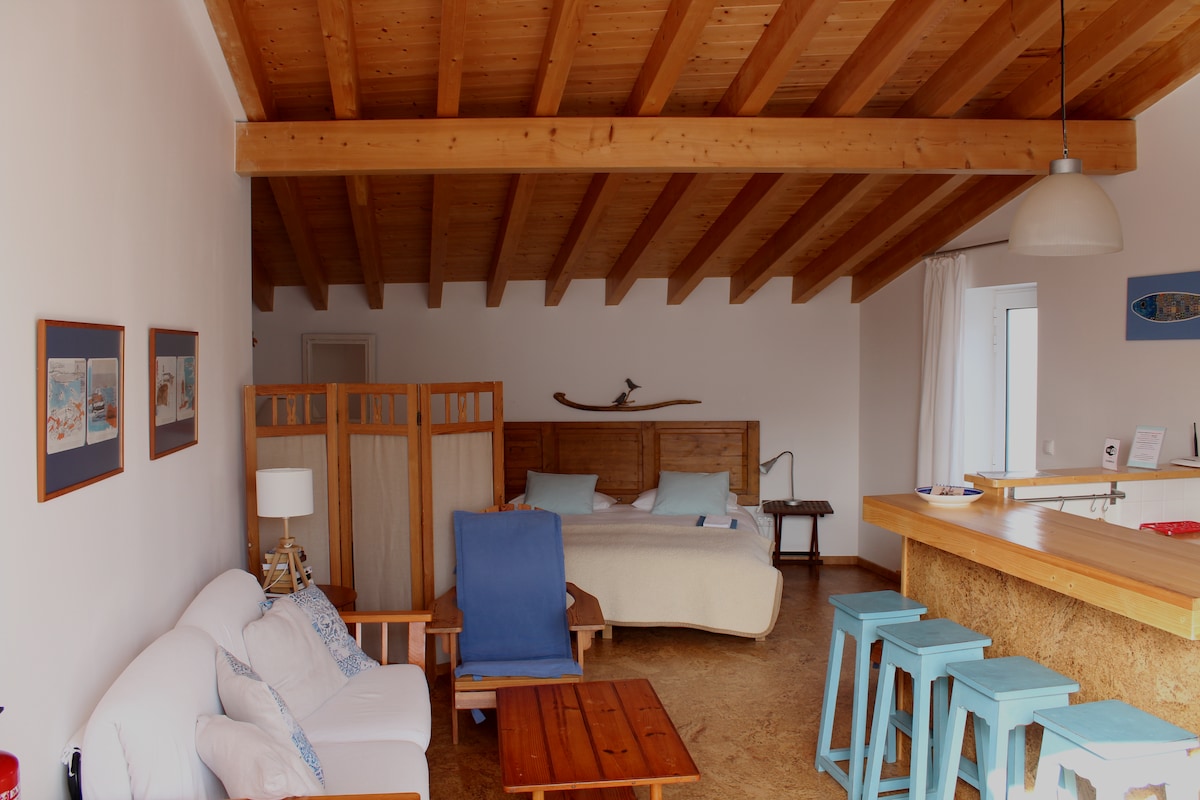 Very nice studio with mezzanine in the traditional village of Carrapateira, 20 meteres away from the church. It has spectacular views to the ocean, the beach of Bordeira and the dunes. It sleeps up to 4 people, even though it is ideal for 2. The studio disposes of Wifi, Smart TV, a complete kitchen with oven, etc., everything you need to spend some marvellous holidays in this beautiful and quiet place. We have 2 other apartments in the same house, each with its own entry.
