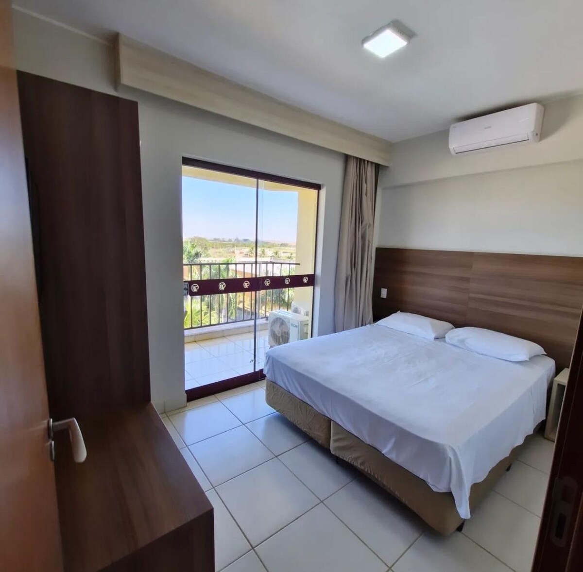 Apartamento com Cama de Casal de 180x200 reversíveis em 2 de solteiro de 90x200, sofá cama muito confortável para casal ou dois usuários= 1 cama de casal de 140x190 (abre em folha), Tv Android Sony de 49', escrivaninha, enxoval de cama e banho, mini kitchen, microondas, geladeira 270L, cafeteira expresso, talheres, acessórios, mesa com 4 cadeiras, ducha alta pressão, secador de cabelos, ar condicionado central em 2 ambientes, cortinas com black out, vista para a piscina