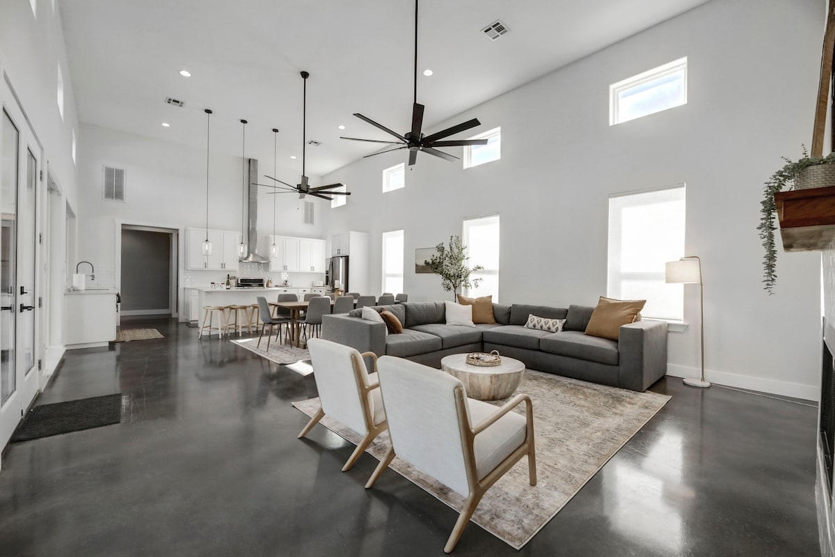 True Texas experience in the barn at a small ranch. See one of the biggest steers in the world at 13.5 long.. Stay in a luxurious loft in the barn constructed with whitewashed shiplap and rustic timbers. Big oversized windows and view the stables and pasture. The oversized cowboy bathtub is a converted water trough. This space features an open floor plan that includes 2 queen plus 1 twin size beds, a kitchenette and entertainment center. Vaulted ceilings make for a cozy stay.