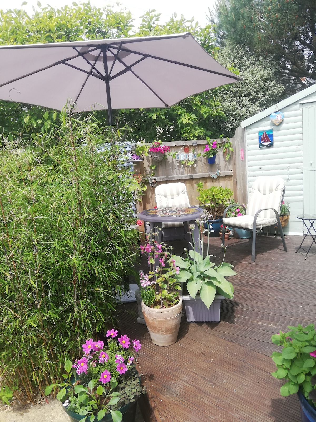 Our Garden Chalet is situated in a lovely south facing garden setting in a nice area. It comprises of one comfortable double bed and has its own private shower room with toilet outside ,adjacent to the chalet. We provide a breakfast and there are tea and coffee making facilities, TV and Wifi. Parking is outside the house on road. Christchurch Rail Station is a 5min walk and it takes only 10 mins to walk to the historic town of Christchurch with its Priory and beautiful river walks.