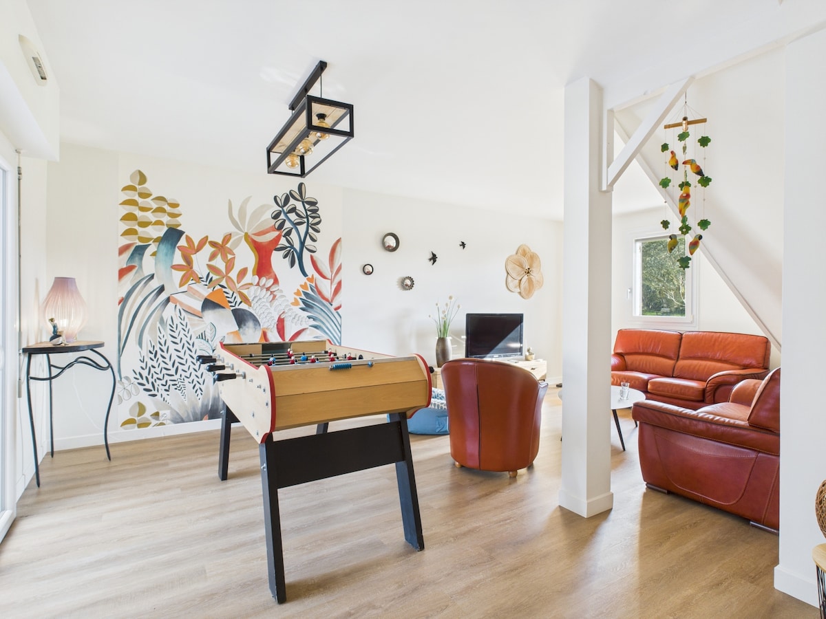 Nel cuore del dominio equestre "Terres Alezanes" di 30 ettari, immerso nella natura e vicino a Nantes/La Baule/Saint Nazaire a 35 minuti. Cottage di charme dallo spirito bohémien chic, architettura originale, estetica raffinata e atmosfera autentica per questa casa con un forte potenziale. Centro ippico e negozio-laboratorio di ceramica in loco, prenotazione di corsi di scoperta, laboratorio genitori-figli, chiedeteci :) Vendita di ceramiche in negozio. Molte piste ciclabili nelle vicinanze!