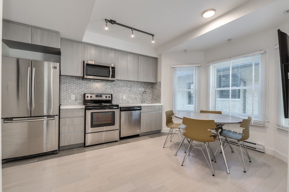 Rifugio luminoso e moderno a Lower Lonsdale, a pochi passi da Lonsdale Quay, lungomare, negozi, birrerie e ristoranti. Include un comodo letto king-size, un letto queen-size e un divano letto queen-size, oltre a una cucina completa, una lavanderia in camera, una zona giorno open space, un patio privato e un bagno elegante. A piedi da caffè, mercati e SeaBus, o a breve distanza in auto dalle montagne Grouse, Cypress e Seymour.