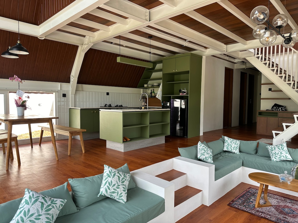 Chalet con quattro camere da letto che abbiamo ristrutturato applicando il concetto di chalet sciistico. Ogni suite dispone di una vasca da bagno in rame che si affaccia su una foresta protetta. I panorami sono incredibili, con vedute sul lago Buyan, sul campo da golf di Handara e sulle ripide montagne sullo sfondo. A 1.400 metri sopra il livello del mare, siamo benedetti da un clima eternamente primaverile durante il giorno e freddo di notte. Svegliati la mattina presto con l'odore delle conifere e fai una passeggiata per vedere galli selvatici, cervi, zibetti e una grande varietà di uccelli.