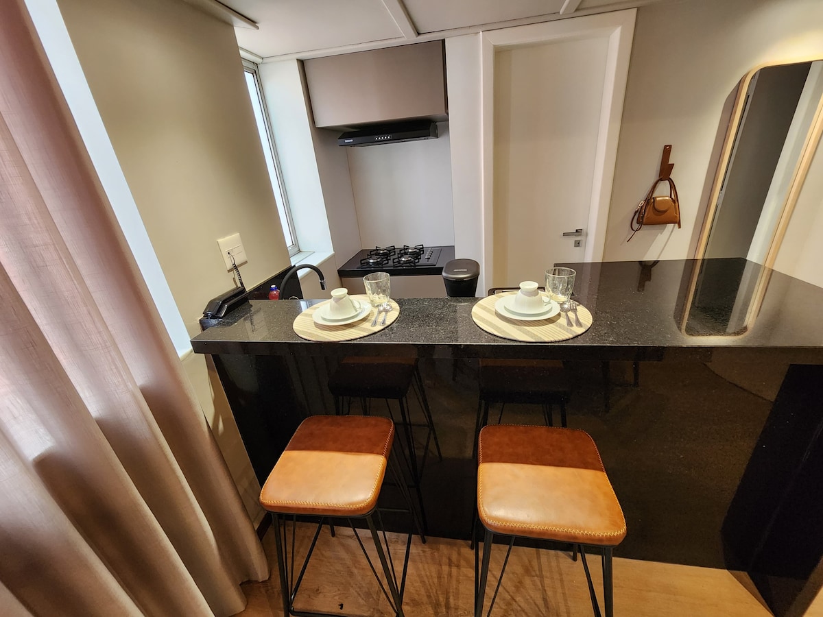 Questo appartamento è stato ristrutturato di recente, moderno, bello e accogliente. La suite dispone di smart TV da 42 pollici, letto matrimoniale grande, aria condizionata e armadio. Nel soggiorno è dotato di tv, wifi l, divano letto e tavolo in granito per lavoro e pasti con cucina americana attrezzata con vari utensili, piano cottura, microonde e minibar. L'appartamento si affaccia su Shopping Pátio Savassi e Serra do Curral Shopping Mall. Si trova nel cuore di Savassi, dove ci sono ottimi ristoranti, farmacia e mezzi di trasporto.
