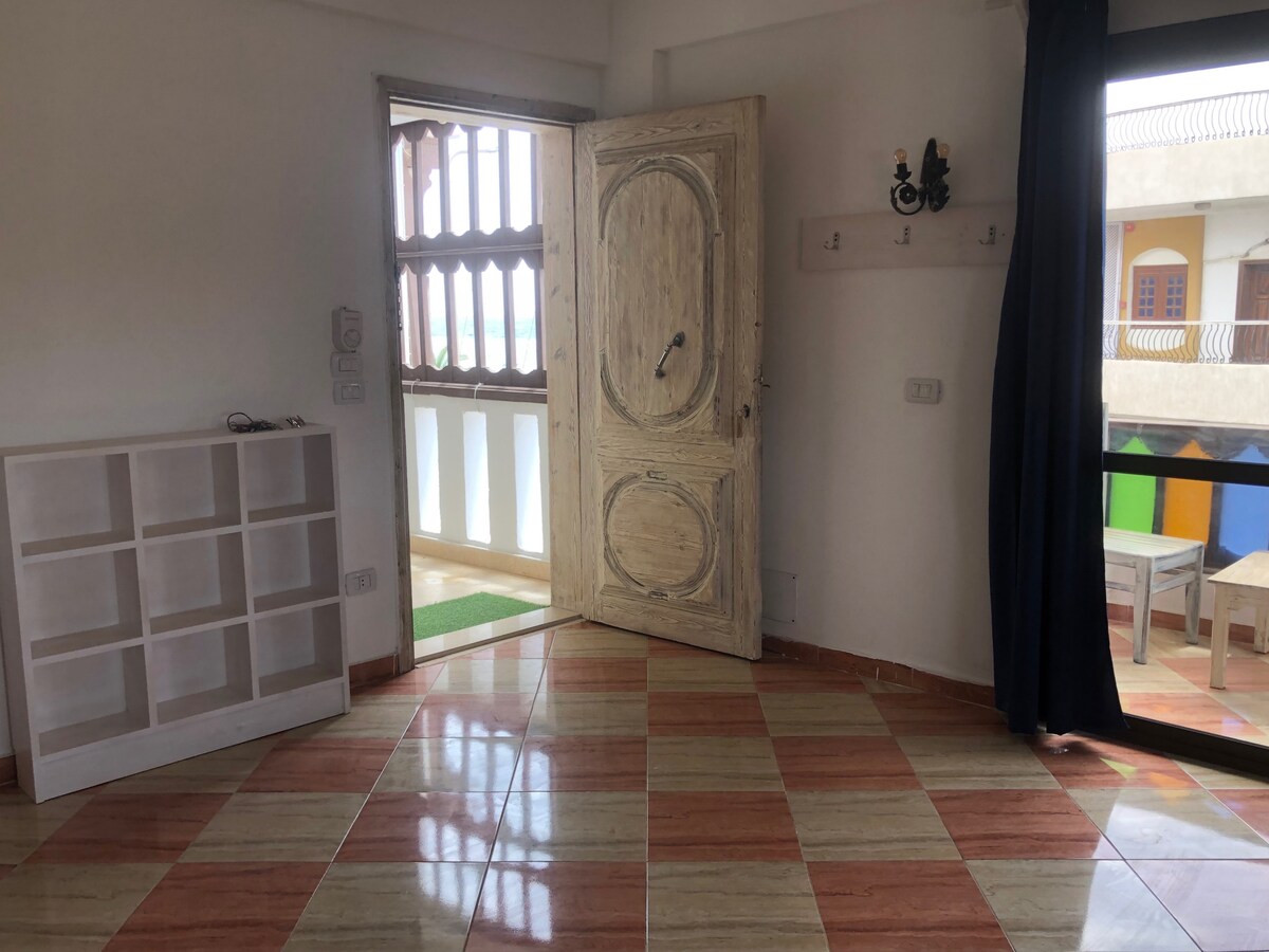Un bellissimo appartamento fronte mare, con vista sul mare, situato direttamente sulla spiaggia di Assalah e sulla barriera corallina di Eel Garden a Dahab. Tranquillo, con spiaggia balneabile e barriera corallina appena fuori, caffè, ristoranti e tutti i negozi nelle vicinanze. Vieni a goderti la migliore vita da spiaggia a Dahab!