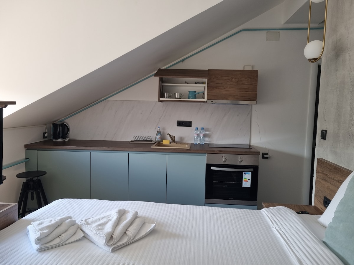Unico. Si chiama "Epi centro lucernario " con un motivo. Vi trovate nel centro di Belgrado, ma godetevi una meravigliosa vista sul cielo appoggiandovi alla poltrona o al letto. Tranquillità serena. Piacevole da vedere e toccare...l'intero appartamento è stato progettato per uno scopo, per i nostri ospiti a sentirsi bello e accogliente... 2 bagni interni e 1 WC separato per gli ospiti. Le finestre del lucernario si aprono largamente, la parte superiore verso l'alto, e la parte inferiore si apre separatamente e fuori, dando la sensazione di stare in piedi su un balcone. Aria condizionata in entrambe le camere e la reception.