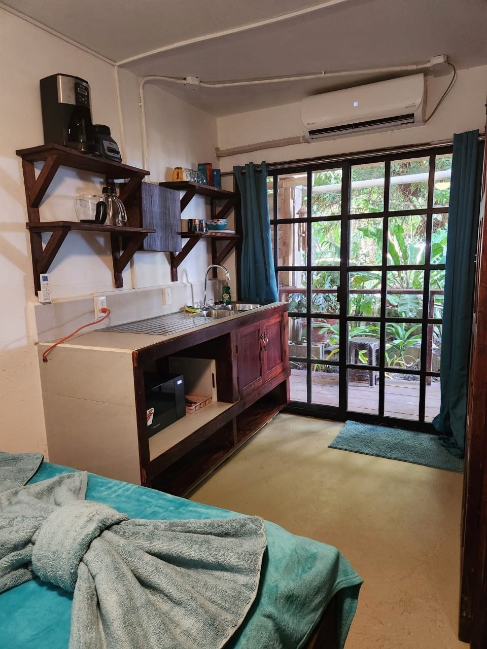 Ampio spazio con alti soffitti, spazioso e al piano terra nel giardino. Privato e tranquillo. Un letto king-size e un letto singolo sono nella tua camera privata. Aria condizionata e una doccia molto privata, con WC e lavandino. Acqua calda e fredda nella doccia e nel lavandino. Oltre 100 alberi all'interno della proprietà con tonnellate di uccelli! C'è un edificio separato con una cucina completa per cucinare o uscire con altri ospiti. Si trova a 3 minuti a piedi dalla spiaggia, dai ristoranti e dai negozi di alimentari. Servizio di lavanderia disponibile!