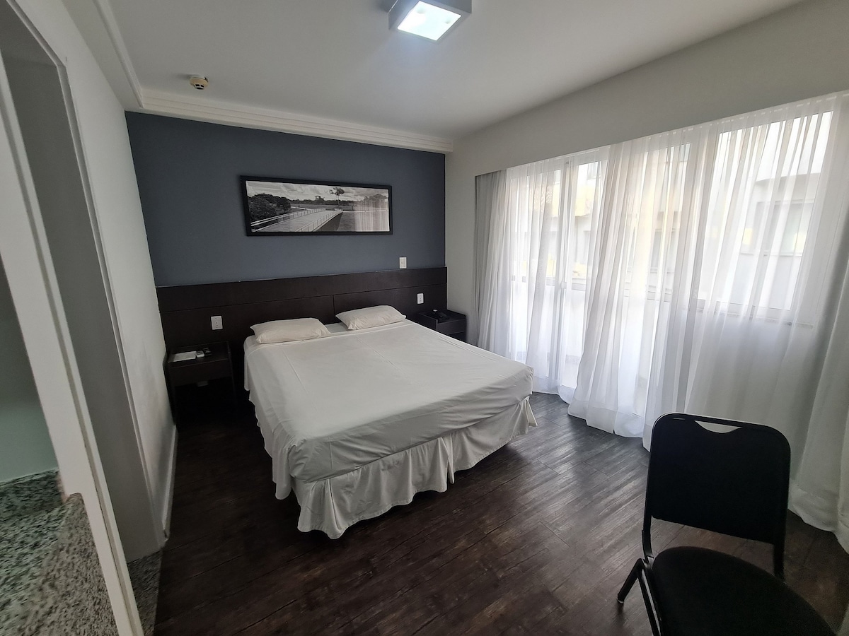 Appartamento al piano terra dell'Hotel Flat San Diego Pampulha. Di fronte a Lagoa da Pampulha. Camera con minibar, forno a microonde, TV, aria condizionata, 2 letti singoli che possono essere trasformati in 1 matrimoniale. La colazione può essere noleggiata direttamente in hotel. Non è previsto il cambio degli asciugamani o la pulizia della camera, a meno che tu non soggiorni una settimana. Le posate sono fornite dal ristorante dell'hotel a consumo. - Non sono ammessi più di 1 animale di piccola taglia. - Non è prevista la pulizia e il cambio di asciugamani/biancheria da letto.