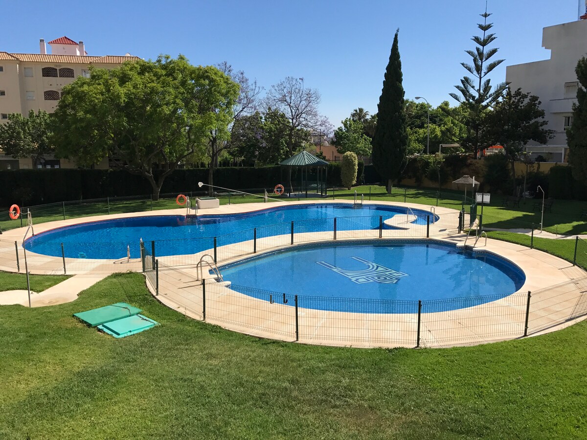 Delizioso monolocale, completamente ristrutturato con bella vista sulle piscine . Molto luminoso e soleggiato (sole pomeridiano). 1° PIANO. A breve distanza a piedi dalla spiaggia (10 min a piedi) e vicino al Parco La Paloma e alla famosa Piazza Bonanza, molto frequentata dai turisti. Il centro di Arroyo de la Miel e il treno per pendolari si trovano a circa 500 metri di distanza (15 minuti a piedi). La Marina si trova a circa 15 minuti a piedi. PISCINE CHIUSE.