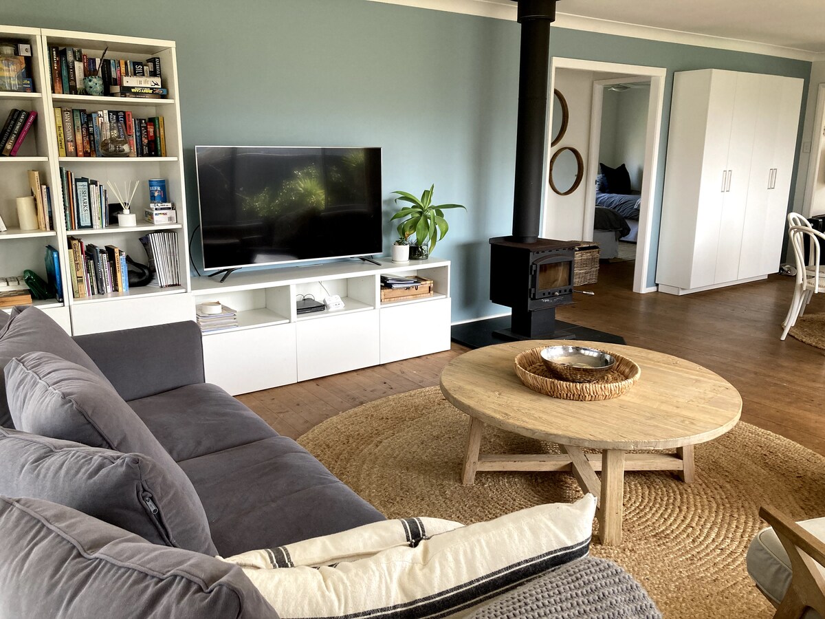 Quintessenza della capanna sulla spiaggia degli anni '50. Raggiungi a piedi la spiaggia, il lago, il Parco Nazionale e il caffè locale. Un letto matrimoniale e 2 letti singoli king-size, cucina e bagno nuovi, aria condizionata, stufa a legna, barbecue e un ampio giardino recintato. Parcheggia l'auto e vai a piedi ovunque. Paradiso per gli appassionati di attività all'aperto: andare in barca, nuotare, fare immersioni, fare surf, andare in bicicletta, andare in kayak, fare SUP e fare escursioni. I canguri visitano la casa, i bambini vanno in bicicletta per le strade. Perfetto per coppie e piccole famiglie.