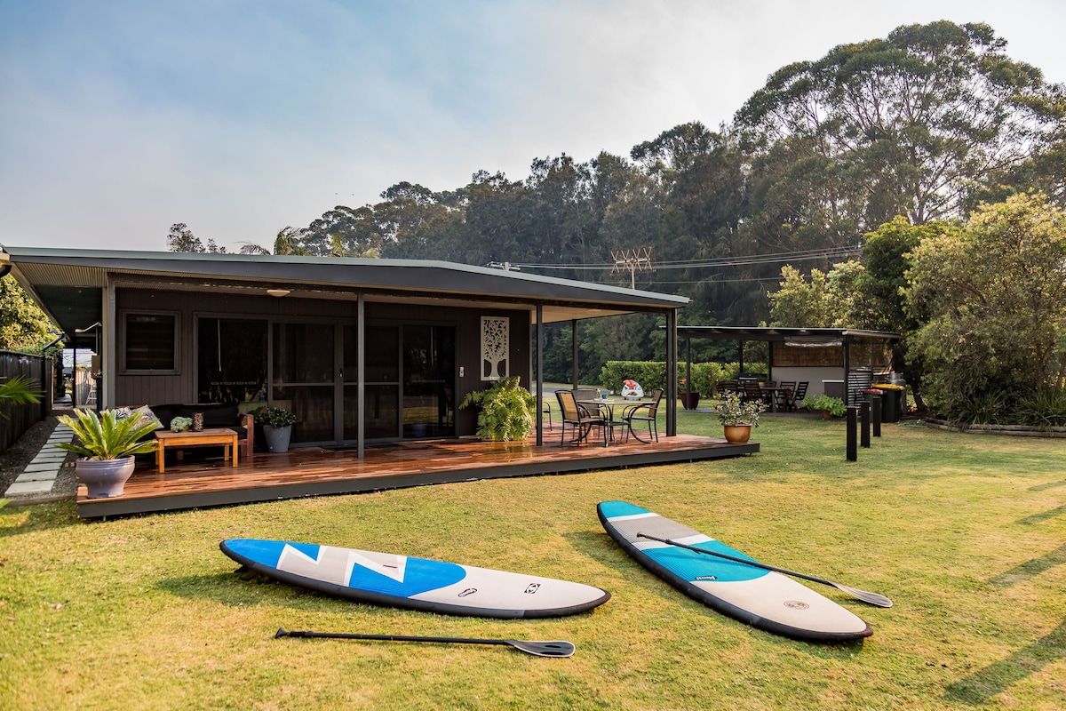 Quintessenza della capanna sulla spiaggia degli anni '50. Raggiungi a piedi la spiaggia, il lago, il Parco Nazionale e il caffè locale. Un letto matrimoniale e 2 letti singoli king-size, cucina e bagno nuovi, aria condizionata, stufa a legna, barbecue e un ampio giardino recintato. Parcheggia l'auto e vai a piedi ovunque. Paradiso per gli appassionati di attività all'aperto: andare in barca, nuotare, fare immersioni, fare surf, andare in bicicletta, andare in kayak, fare SUP e fare escursioni. I canguri visitano la casa, i bambini vanno in bicicletta per le strade. Perfetto per coppie e piccole famiglie.