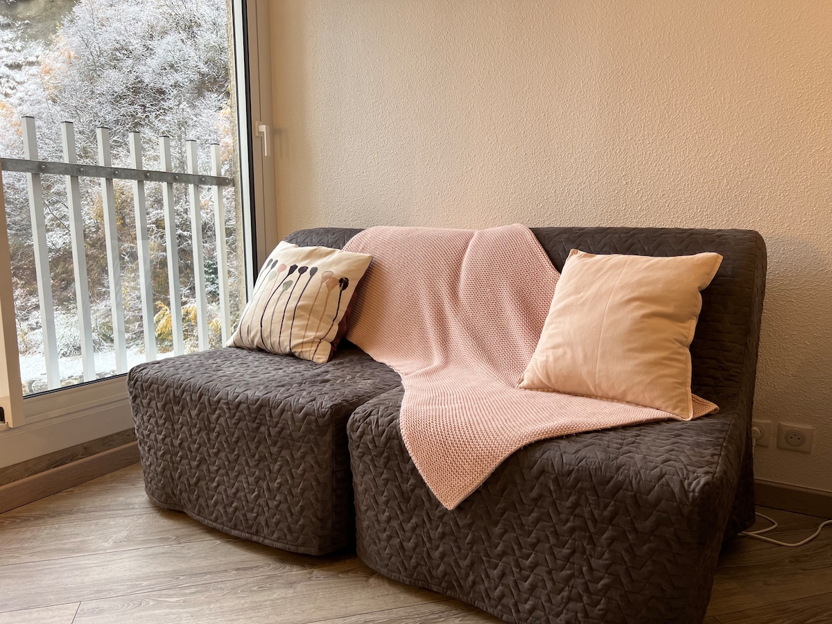 Appartamento attrezzato con: - 1 camera da letto con 1 letto matrimoniale (160x200); - 1 cabina per 2 letti a castello; - 1 soggiorno, con divano ad angolo (2 posti letto); - 1 angolo cottura con tavolo pieghevole (6 pers.), TV, forno, frigorifero, lavastoviglie, ...; - 1 SDB; - 1 WC; - 1 balcone con tavolo, panca e sedie (vista montagna); - Internet Box (WiFi gratis); - Posto auto; - Locale sci/bici comune all'edificio; - Piscina condivisa (gratuita) utilizzabile luglio/agosto (vista sulle montagne).