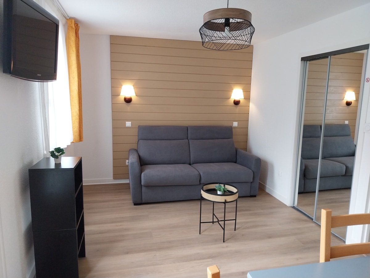 È il momento di ricaricarsi? Ecco un luogo adatto: monolocale di 26 m2 ristrutturato con materiali nobili (pietra naturale, legno massiccio). L’arredamento è semplice, senza elementi superflui, il che invita a concentrarsi sull’essenziale, a prendersi del tempo e a rilassarsi, al suono del fiume. Si trova nel villaggio di Bielle in Valle d'Ossau, a 5 minuti dal colle di Marie-Blanque e a pochi minuti a piedi dal lago di Castet e da piccoli negozi: panetteria, alimentari, ristoranti.