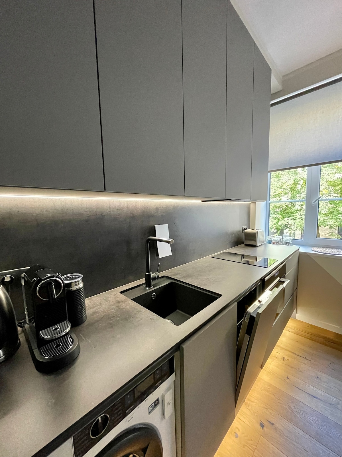 Luminoso e tranquillo monolocale con vista sull'incantevole giardino Vērmanes, che offre tranquillità e vegetazione lussureggiante nel cuore di Riga. Ideale per coppie o viaggiatori solitari, il monolocale si trova nell'ex Biblioteca Nazionale della Lettonia, unendo carattere storico e comfort moderno in un ambiente tranquillo e sicuro. A pochi passi dal centro storico di Riga, goditi le principali attrazioni della città, i caffè, le enoteche, i ristoranti e l'elegante Berga Bazārs, vicino a tutto ma meravigliosamente lontano dalla folla di turisti.