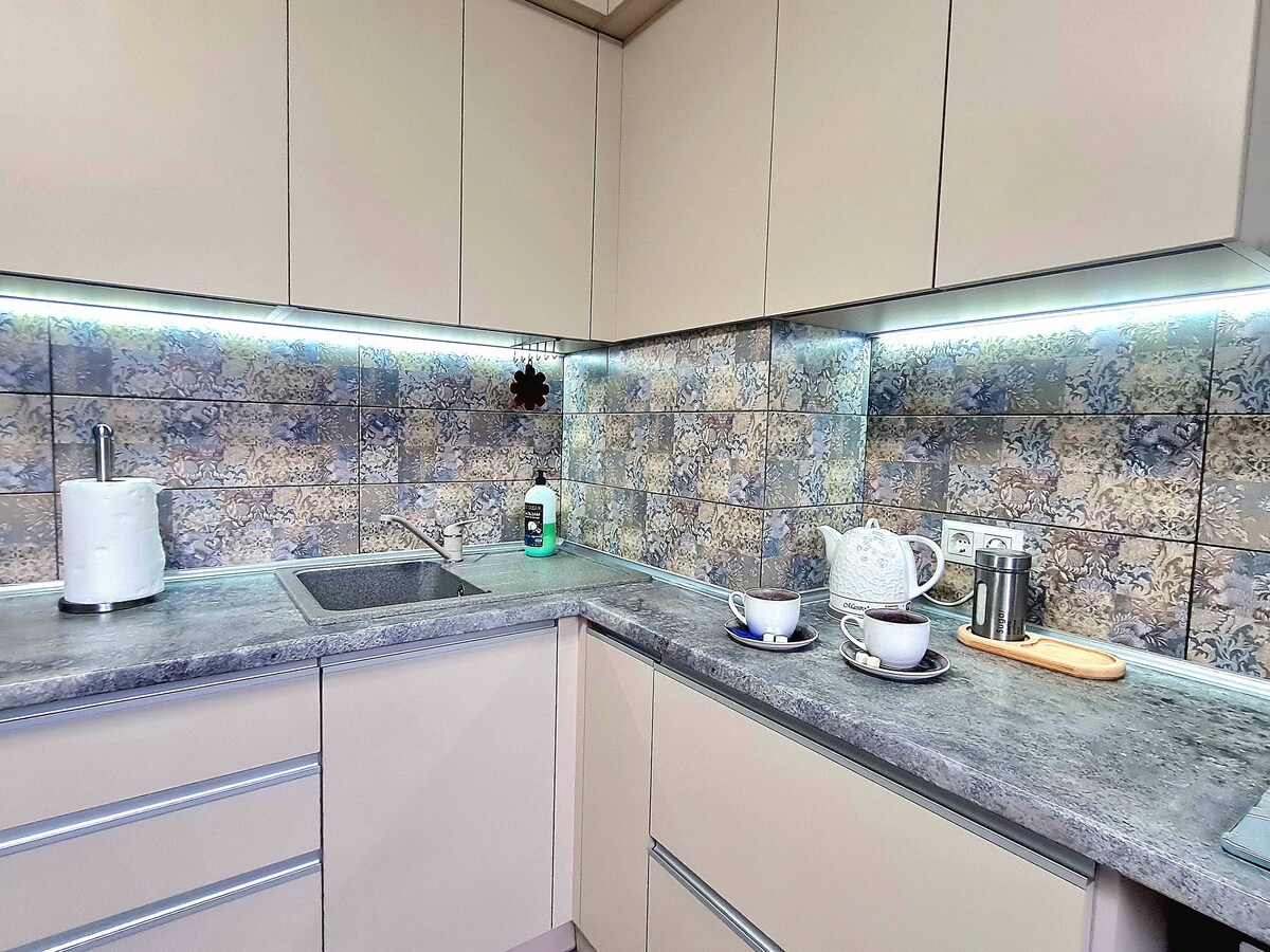 Cozy and freshly renovated studio apartment, which is not shared with the house owners. Located near the city center. It has everything you need for a comfortable stay and living. What's nearby? - Supermarket (round-the-clock market) and pharmacy - 3 minutes on foot - Branch of PrivatBank - 7 minutes - Central City Bazaar - 10 minutes - City center - 20 minutes - Regional Children's Hospital - 10 minutes Free parking in front of the house.