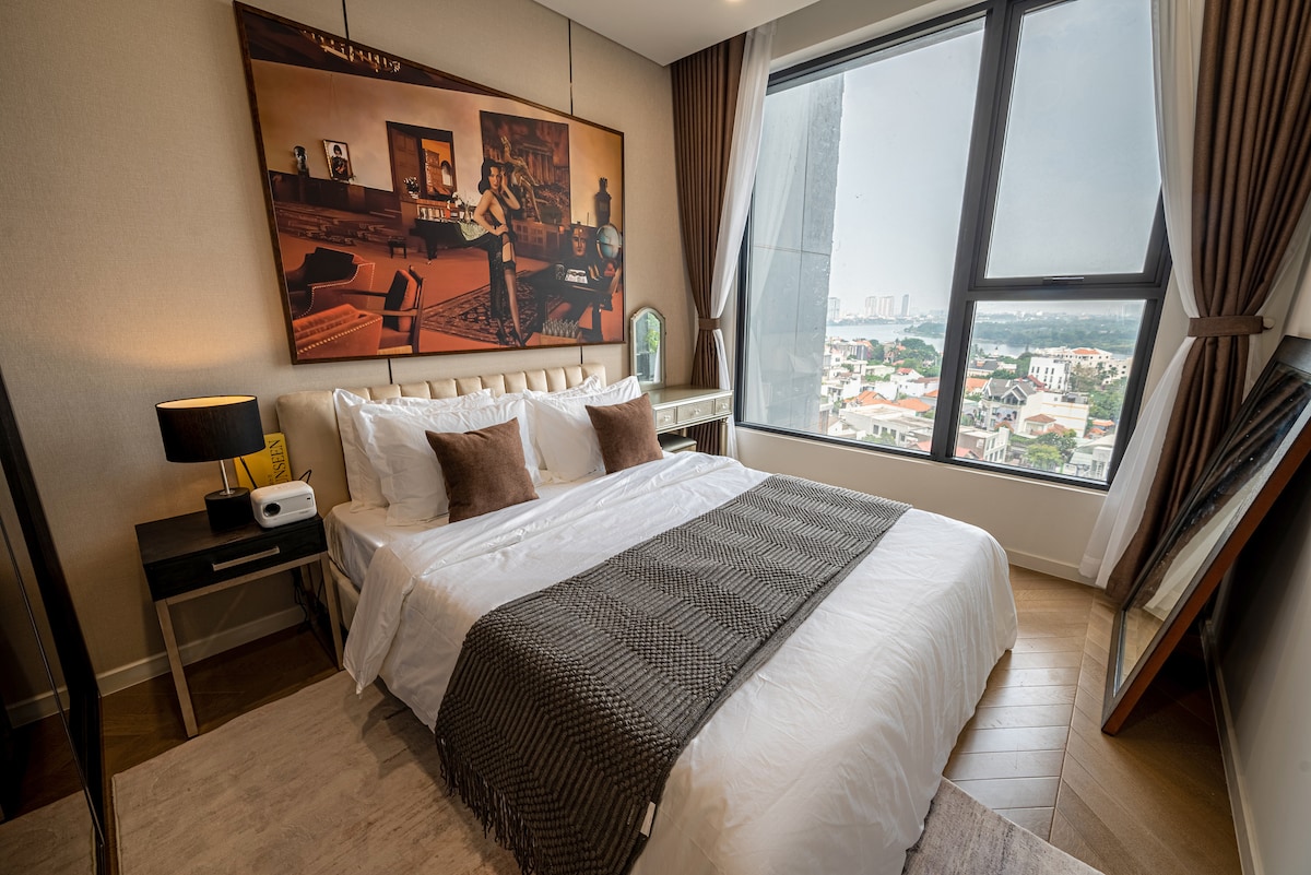 ⸻ L'appartamento è splendidamente progettato in stile Wabi Sabi e si trova al piano alto della torre West LUMIÈRE Riverside, nuova in via Tay Thao Dien, Distretto 2, stile artistico. Sia la finestra della camera da letto che il balcone hanno una vista panoramica su tutta la città, sul viale e sulla piscina. Un appartamento unico con uno spazio bellissimo, con 1 ampio soggiorno, 1 sala da pranzo, 1 cucina confortevole, 1 balcone con tavolo da tè, 1 zona per asciugare i vestiti, 1 bagno con servizi igienici, 1 grande camera da letto per 3 persone, sicurezza di lusso, di alta classe.