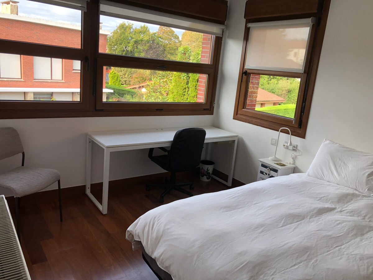 Camera privata in casa a schiera con salotto ad uso esclusivo degli ospiti. L'alloggio si trova in un quartiere accogliente e pittoresco a pochi minuti dal centro di Bilbao. La casa, completamente esterna, dispone di due patii all'aperto, accesso alla cucina con tutti gli utensili necessari e parcheggio gratuito nelle vicinanze. Sarò lieta di offrirti informazioni su Bilbao, consigli su bar, ristoranti e attrazioni turistiche. N. di registrazione: LBI00493