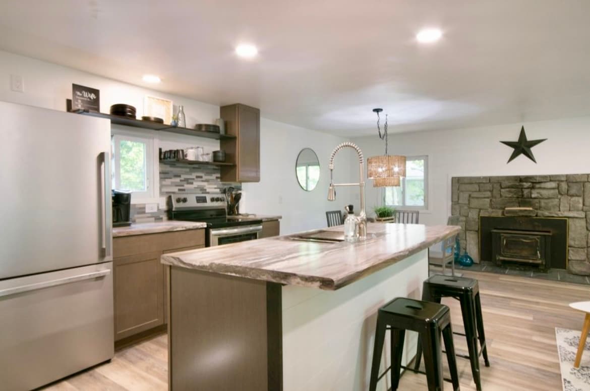 Very unique apartment downtown Otsego, walkable to shops, restaurants and bars. Recently renovated, this space sits above the vault of a 1920's era bank with a rustic/industrial feel. Featuring rustic ceramic tile in the kitchen, bathroom and work area, bamboo floors in the living/bedroom, granite counters, tile backsplash, copper sinks, and tile shower with glass door. 65" smart flatscreen tv, electric fireplace, WIFI, Central Air/Heat, and built in butcher block desk.