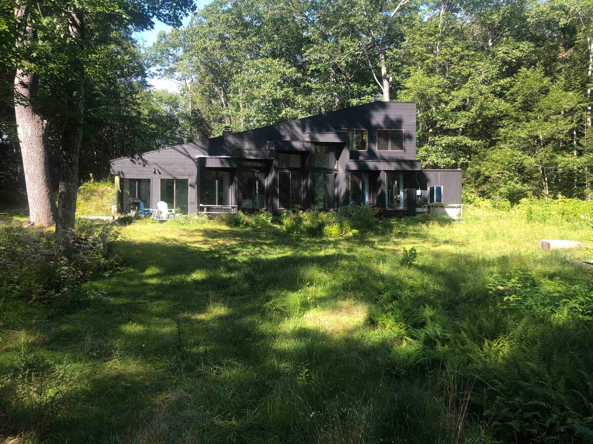 Relax, recharge, & escape here. A unique & peaceful guest house in the woods of Lamoine, Maine with large windows looking out to the woods. Close enough to Bar Harbor / Acadia National Park (45 minutes) but removed from the hustle & bustle. A 10-minute walk down a gravel road to a beach in Lamoine with distant views of Acadia National Park. Enjoy all weather with our new wood stove fireplace surrounded by large windows. We have a comprehensive guidebook for our guests upon check-in.