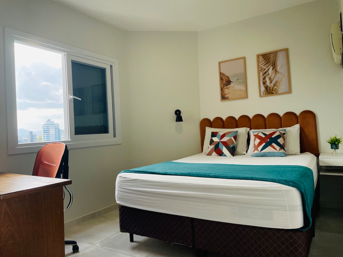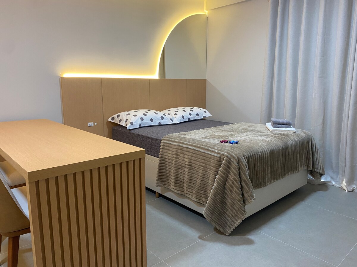 Sofisticato monolocale situato a 800 metri dal parco Vila Germânica - sede di eventi come l'Oktoberfest. Circondato da ristoranti, bar e supermercati. Tutto per il vostro comfort: Smart TV 50" Samsung, aria condizionata split, doccia a gas, wifi fibra 240mb, cucina completa con frigorifero Brastemp, forno a microonde, forno, piano cottura, cappa, macchina per il caffè, depuratore d'acqua, lavatrice e asciugatrice, armadio, e naturalmente un letto matrimoniale invitante con il miglior materasso!