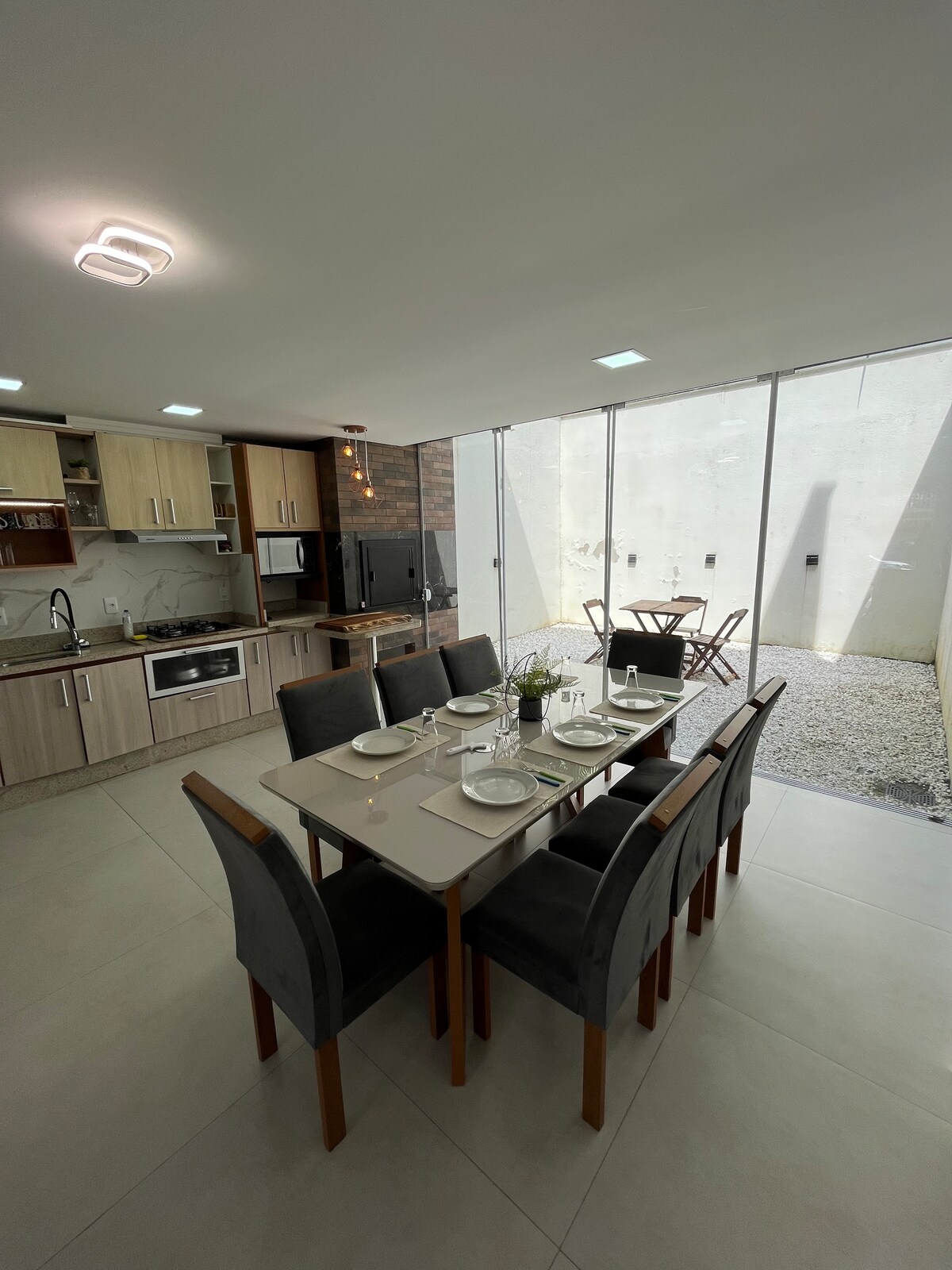 Casa confortevole e completa con 3 camere da letto (una con bagno interno), soggiorno, cucina, ufficio, 1 bagno sociale, barbecue, garage privato, giardino e area di servizio. Ideale per ospitare famiglie, gruppi di lavoro o partecipanti a eventi. Ha una posizione eccellente, vicino alla BR-470 (3 min) e con facile accesso al centro e a Vila Germânica (12 min). Vicino a panetteria, supermercato, pizzeria, farmacia e negozi - Parco Europeu e Norte (8 min).