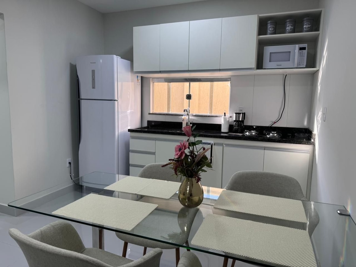 Si tratta di un appartamento con 2 camere da letto completamente arredato con letto matrimoniale in ciascuna delle camere da letto, soggiorno, sala da pranzo, cucina privata, bagno e cortile. Adatto a due coppie o imprenditori. I letti singoli aggiuntivi e un letto matrimoniale sono disponibili rispettivamente a una tariffa di 30 e 50 reais, per notte. Può ospitare da 2 a 8 persone. Con il 100% di sicurezza.