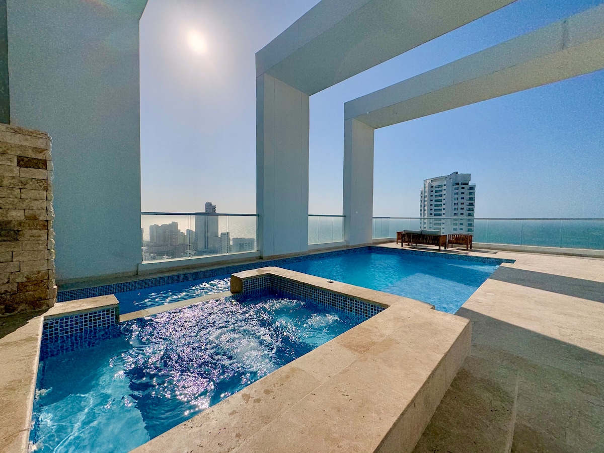 Panorami mozzafiato e posizione perfetta Rilassati in un ambiente lussuoso e splendido in questo attico con 1 camera da letto e 1 bagno, arredato con gusto e situato al 36° piano di uno degli edifici più recenti e prestigiosi di Cartagena: Palmetto Beach. Ampia vista mozzafiato sull'oceano. Arredato secondo gli standard degli hotel di lusso, con TV a grande schermo in tutte le camere da letto e nel soggiorno. I servizi dell'edificio includono una palestra completamente attrezzata e una piscina all'ultimo piano.