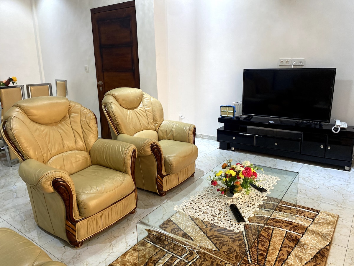 Appartamento di lusso Atmosfera Led -Wifi / canale + - Ampio soggiorno / Ampia cucina - Acqua calda -Smart TV 65 pollici - 2 bagni -2 Camere da letto con armadio - Aria condizionata in soggiorno e camere da letto -Servizio di pulizia - Gruppo elettrogeno -Parcheggio - Sorveglianza, telecamere di sorveglianza -Terrazza