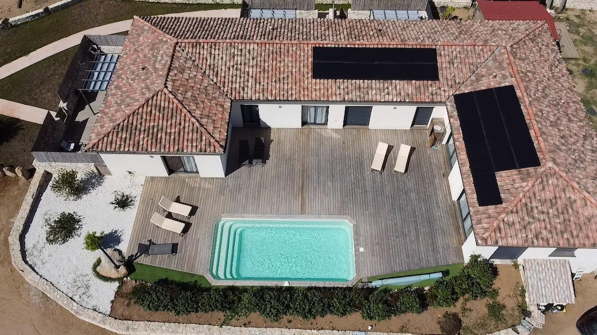 Villa indipendente climatizzata con 3 camere da letto con piscina privata riscaldata /splendida vista mare a 150 m ai margini del Golfo di Pinarello giardino privato e posto auto coperto di fronte alla villa / tavolo da ping pong calcetto / bocce di fronte alla villa e giochi per bambini Questo alloggio tranquillo offre un soggiorno rilassante per tutta la famiglia.
