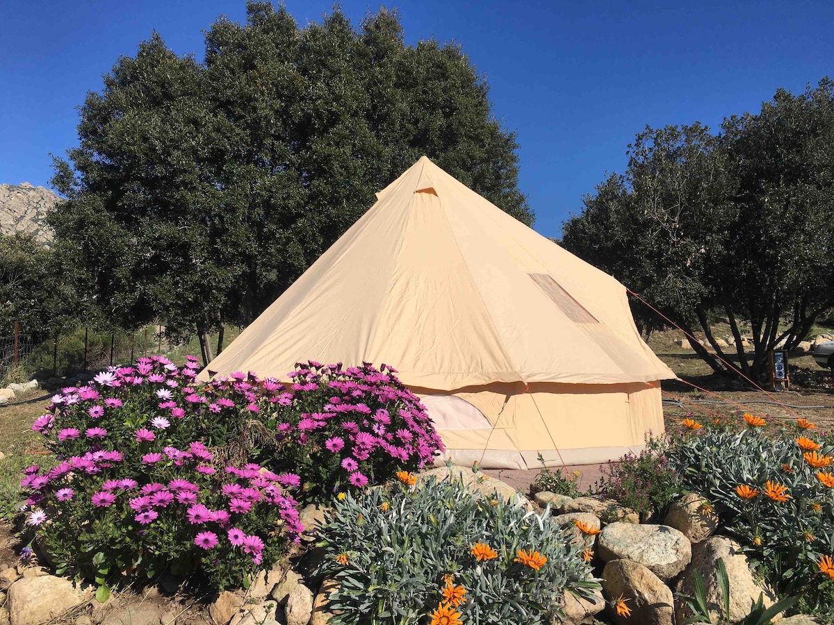 Ampie e comode tende con letto matrimoniale immerse nella incontaminata campagna gallurese a 6 km da Palau e Cannigione e a pochi minuti di macchina dalle spiagge del Golfo di Arzachena. Location ideale per chi desidera vivere una vacanza a stretto contatto con la natura, lontani dalla confusione ma senza rinunciare al confort e alla privacy. I bagni sono ad uso esclusivo delle tende e si trovano a circa 30mt di distanza. La prima colazione è servita all’aperto nella zona comune della casa.