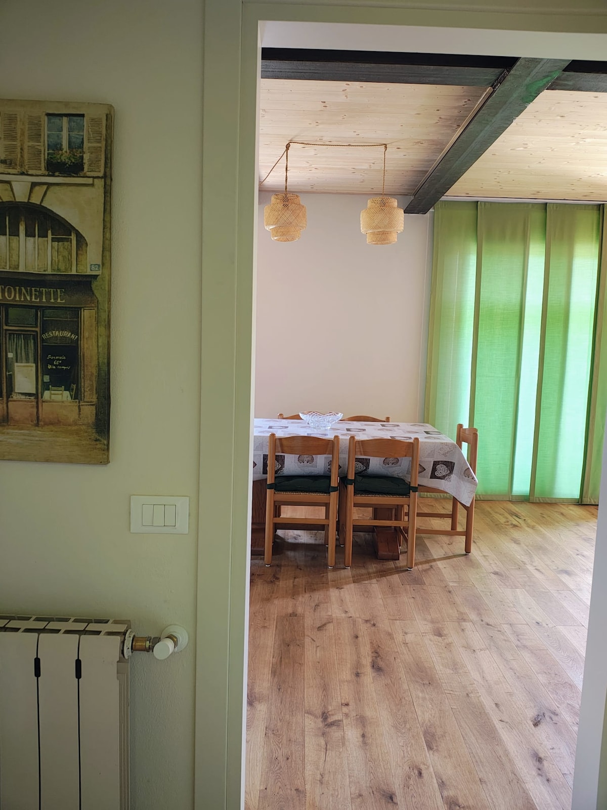 la villa è divisa in due appartamenti, quello di destra al piano terra troviamo la cucina compresa di tutto il necessario per cucinare, microonde e lavastoviglie, il salotto con il camino e stufa a legna che vi terranno al caldo, dal salotto si ha accesso al balcone e alla dependance che affaccia sul giardino e bosco privato perfetta per godersi la colazione con i raggi del sole che vi scaldano. primo piano troviamo le due camere da letto matrimoniali o doppie e il bagno con vasca.